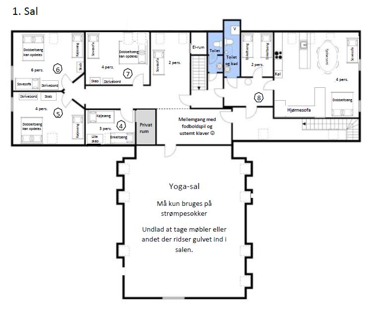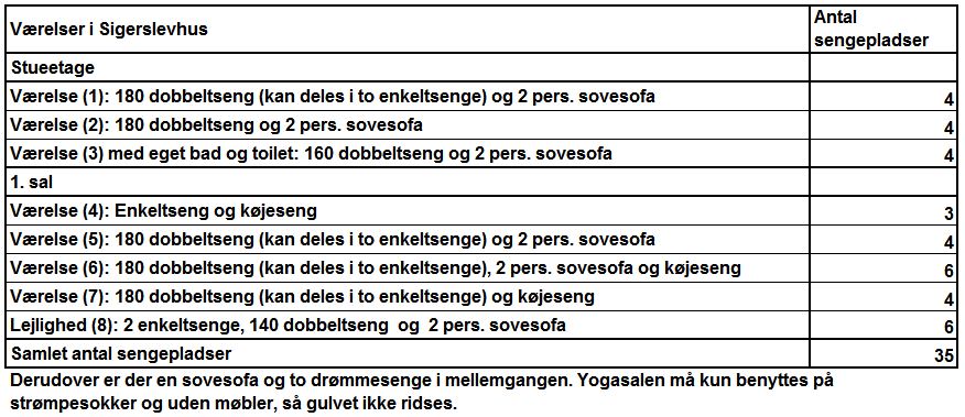 Sengepladser, dyner og hovedpuder følger med i prisen. Sengepladser er uden sengelinned og håndklæde, som kan lejes for for 95 kr. pr. sæt pr. dag eller 125 kr. pr. sæt for længere ophold. Derudover skal der medbringes sæbe, viskestykke, toiletpapir mv.