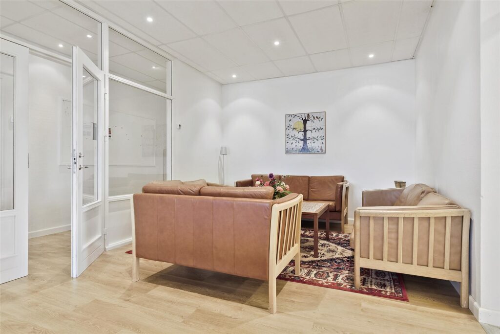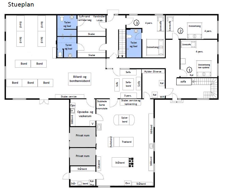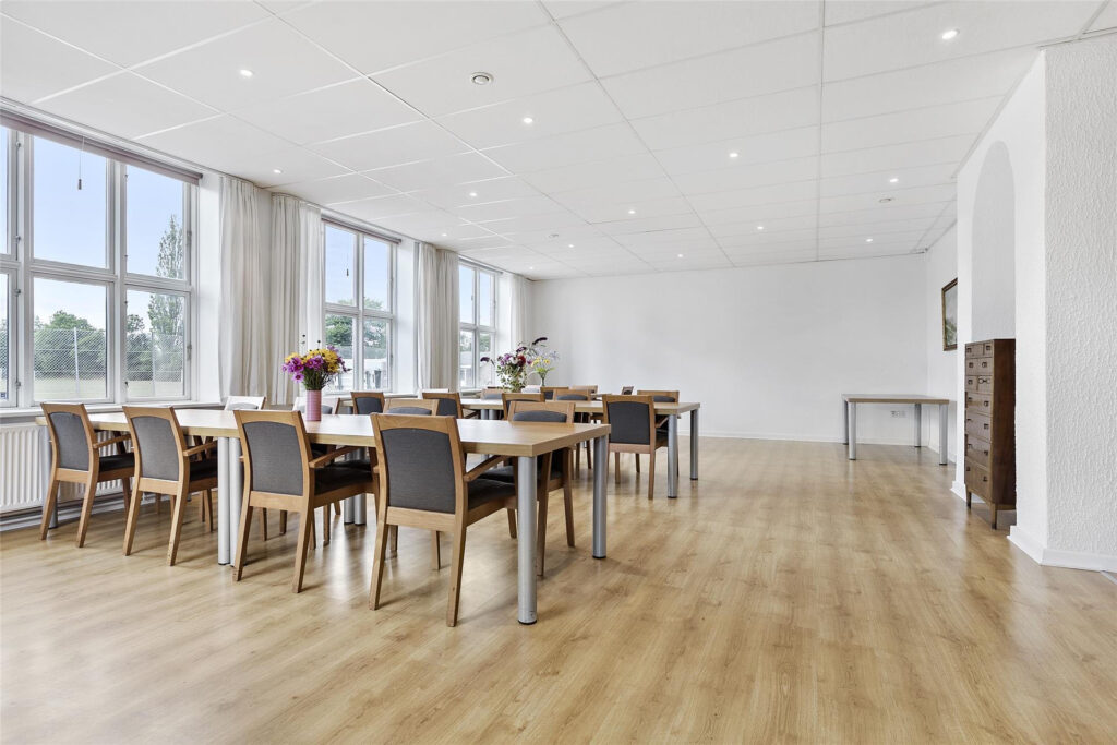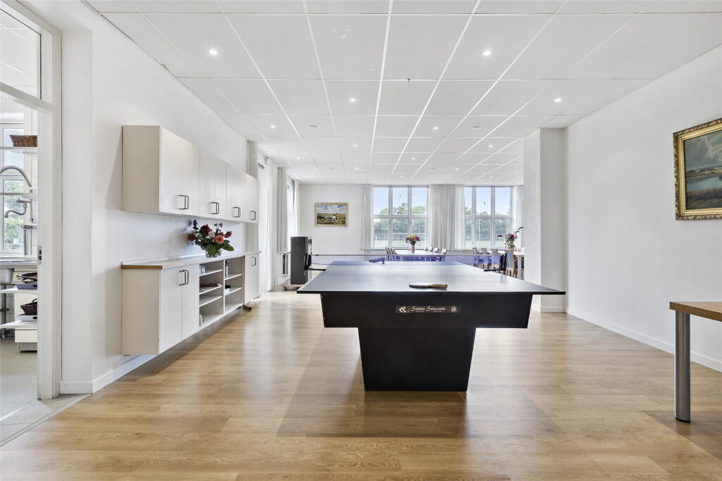 I opholdsrummet er der bord og stole som du kan flytte rundt på som du ønsker. Der er nemt plads til 60 og flere hvis I sidder tæt.